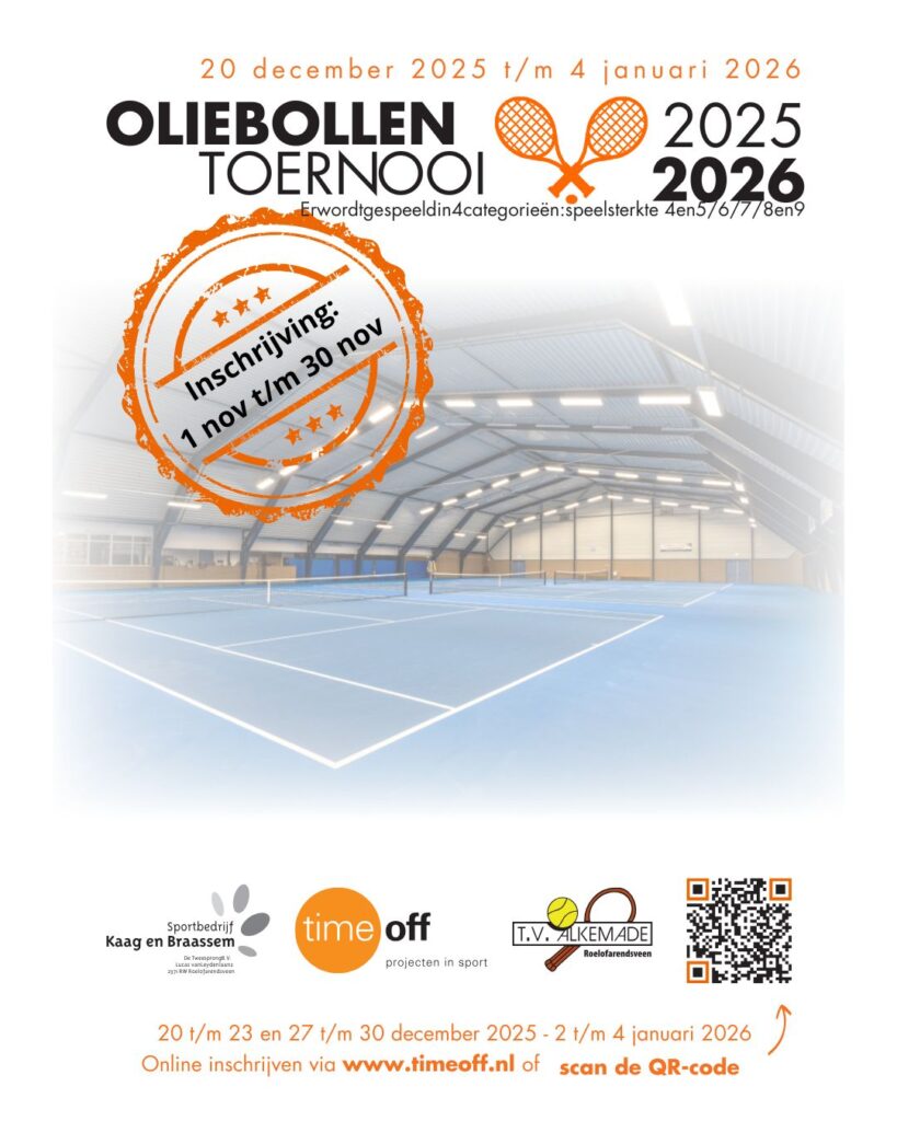 Inschrijven kan eenvoudig via Het Oliebollentoernooi Tennistoernooi Kaag & Braassem – Timeoff of de QR-code op de afbeelding onder dit bericht. Wees er snel bij, want het aantal plekken is beperkt.