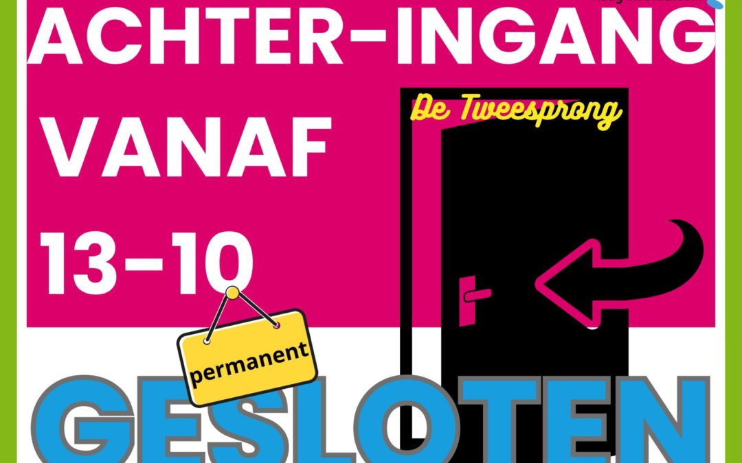 Vanaf maandag 13 oktober is de achteringang van sportcomplex De Tweesprong permanent gesloten. Deze beslissing is genomen naar aanleiding van meldingen van ernstige overlast, waardoor openstelling aan de achterzijde niet langer verantwoord is. We vragen alle bezoekers om voortaan uitsluitend de hoofdingang te gebruiken. Zo houden we het sportcomplex samen een veilige en prettige plek voor iedereen.